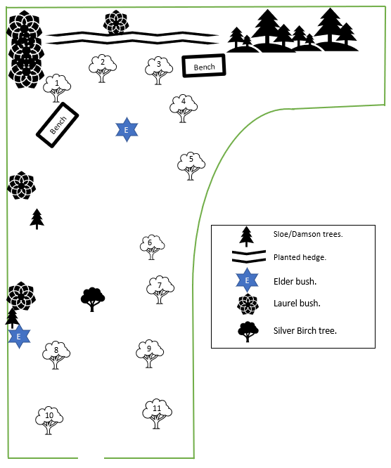 Norris Hill Community OrchardThis map shows a rough plan of the orchard with the names of the fruit trees where known. The links below will enable you to find out details about each of the varieties. ![]() Click on each of the links to find out more details about each variety. 1: Ornamental Crab Apple tree, planted in 2024 John Downie 2: Plum tree, kindly donated in 2023. Variety is not known. 3: Pear tree, kindly donated in 2023, probably Conference 4: Pear tree, kindly donated in 2023, Variety is not known. 5: Plum tree, kindly donated in 2023. Vaiety is not know. 6: Dessert Apple tree, planted in 2022 James Grieve 7: Pear tree, planted in 2022, Louise Bonne de Jersey 8: Dessert Apple tree, planted in 2022 Allington Pippin 9: Cooking Apple tree, planted in 2022 Lord Derby 10: Dessert Apple tree, planted in 2022 Lord Lambourne 11: Dessert Apple tree, planted in 2022 Egremont Russet |